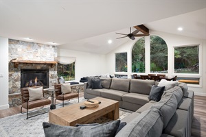 Living Room: This room is set up for a variety of uses. The large sectional couch (14 ft x 12 ft) plus two accent chairs can easily seat 12 adults for a movie night. A 80" 4K TV with Apple TV interface is mounted on the wall and set up with several streaming services. The gas fireplace provides warmth and ambiance to the entire room. There is a 6-person counter height table just behind the sectional couch, allowing groups to play games or have snacks while watching TV or socializing with others on the couch. In the rear of the room is a reading nook with a comfy window seat and couch. Double doors open from the living room to the side deck and give access to all the outdoor amenities.